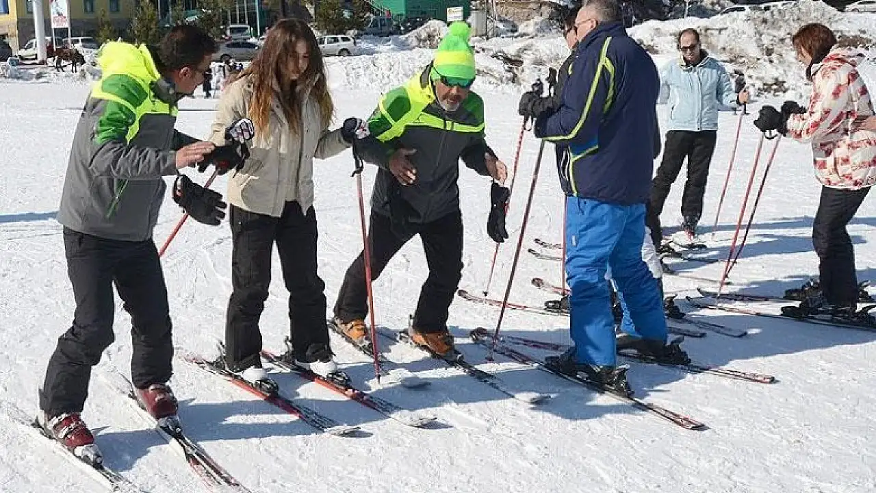 Kars'ta, 'Kayakta Engel Tanımıyoruz' Projesi kapsamında bir araya getirilen bir grup görme engelli, antrenörler gözetiminde Cıbıltepe Kayak Merkezi'nde kayak yapmanın mutluluğunu yaşadı.