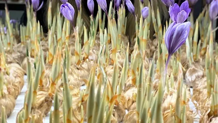 Şeyda Yoldaş, "1 Ekim gibi safranlarımızı odaya aldık, kasım ortası gibi hasat yapmaya başladık. Hasatta elle tek tek çiçekler koparılıyor. Yeşil yapraklar konusunda topraktakine nispeten çok avantajlıyız. Yeşil yapraklarımız çok önemli. Gelecek sene soğan alabilmek adına çok önemli. Onlara zarar vermeden biz burada daha kolay çalışabiliyoruz. Tarlada bu çok mümkün olmuyor. O yüzden tarlada soğan gelişimi biraz yavaş oluyor. Biz her sene burada soğan alıp, soğan satışından ek gelir elde edebiliyoruz. Safran çiçeği, bir gecede açıyor.