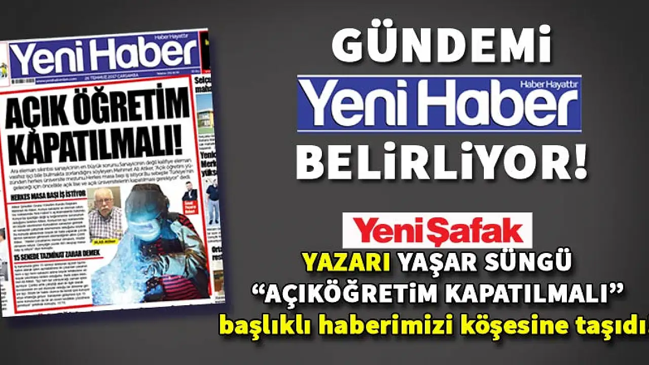 Yeni Haber Gazetesi gündem belirlemeye devam ediyor. 'Herkes masa başı iş istiyor. Açıköğretim kapatılmalı' başlıklı haberimiz bugün de Yeni Şafak yazarı Yaşar Süngü'nün köşe yazısına konu oldu.