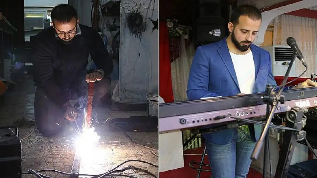 Hatay'ın Antakya ilçesinde, 18 yıldır tabelacılık yapan Kapıcı, gündüz reklam tabelaları hazırlarken akşamları da düğünlerde piyanistlik yapıyor.