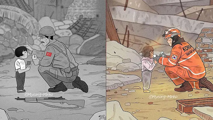 Güney Koreli çizer Myeong Minho, 6 Şubat'ta meydana gelen depremler sonrasında taziye mesajını anlamlı bir çizim yaparak Türkiye ile Güney Kore arasında 73 yıl öncesine uzanan kardeşlik bağlarıyla tasvir etti. Minho, Kore Savaşları'nda Türk askerinin desteğini ve depremler sonrası Türkiye'ye gelen Güney Kore kurtartıcılarının desteğini iki ayrı çizimle vurguladı.