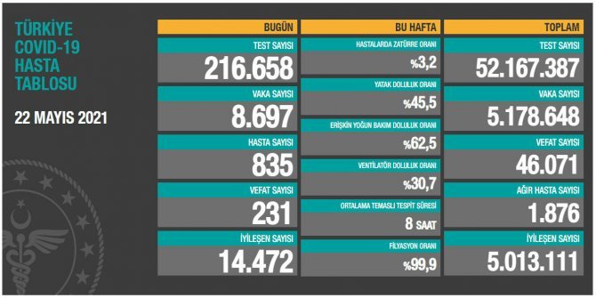 Türkiye'de son 24 saatte 8 bin 697 yeni vaka tespit edildi, 835 yeni hasta belirlendi. 231 kişi vefat etti. 14 bin 472 kişinin daha iyileşmesiyle COVID-19'u yenenlerin sayısı 5 milyon 13 bin 111'e yükseldi.