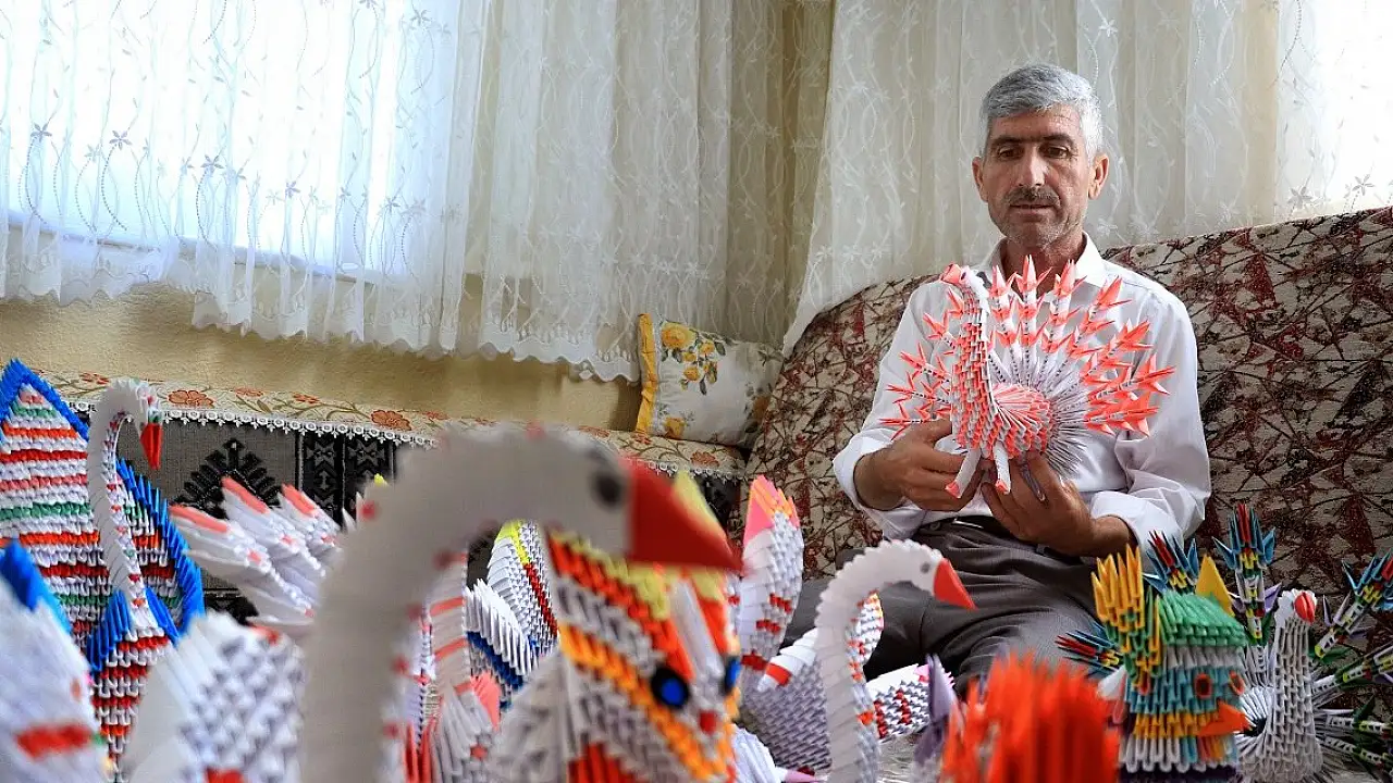 "Evlere kapandığımız dönemde internetten bir adamın kağıt katladığını gördüm. 'Bu adam kağıdı neden katlıyor?' diye merak ettim. Sonuna kadar izledim. Ortaya müthiş bir eser çıkarttı. Kuğu yaptı. 'Ben de yapabilir miyim?' diye düşünürken uğraşamaya başladım. Adamın yaptığı gibi aynısını yapmaya çalıştım. Uğraşa uğraşa başardım. Köyde artık bana 'kağıtlara hayat veren adam' diyorlar. 'Boş bir kağıt, ne olacak yırtıp at.' Hayır o yırtıp atılmaz. Ona ben hayat veriyorum. O kağıdı biriktirip kuğu yapıyorum."