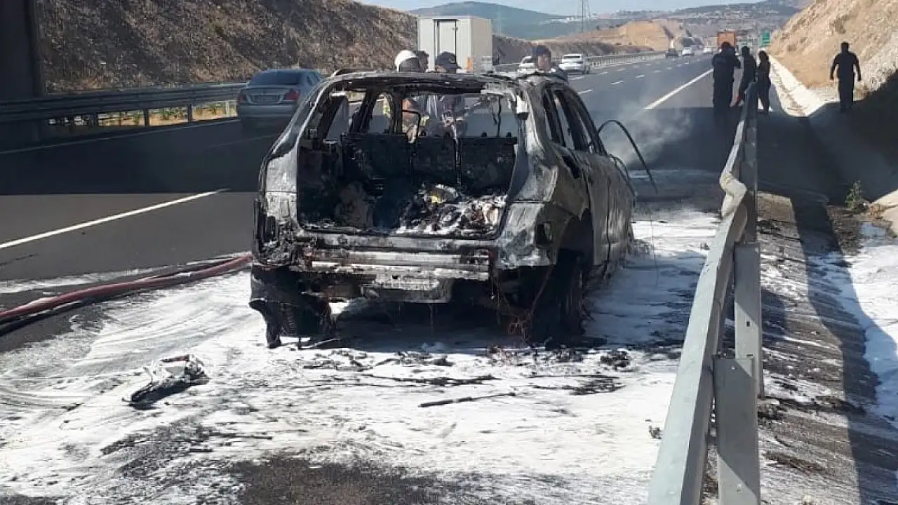İzmir'in Aliağa ilçesinde, Kuzey Ege Otoyolu'nda gurbetçi ailenin içinde bulunduğu otomobil seyir halindeyken alev alıp yandı.