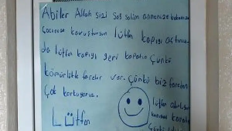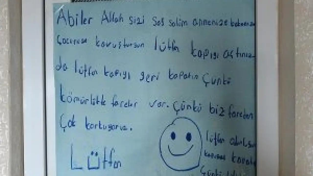 "Abiler Allah sizi sağ salim annenize babanıza kavuştursun" diye başlayan birinci notta, "Lütfen kapıyı açtığınızda kapıyı geri kapatın çünkü kömürlükte fareler var. Fareden çok korkuyoruz, lütfen." ifadeleri yer aldı. Evin ikinci bölümünde üzerinde gülümseyen yüz çizili notta da "Allah sizi korusun, çocuğunuza kavuştursun, lütfen gene kapıyı kapatın çünkü fareler içeriye gelmesinler, ben fareden çok korkarım." ifadelerinin yazılı olduğu görüldü.