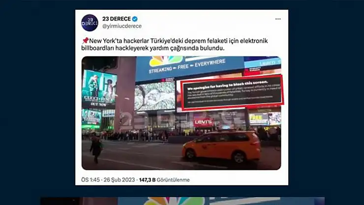 İLETİŞİM Başkanlığı Dezenformasyonla Mücadele Merkezi, Kahramanmaraş merkezli depremlerle ilgili '25-26 Şubat Dezenformasyon Bülteni'ni yayımladı. Bültende hacker'ların, New York'ta elektronik billboard'ları 'hack'leyerek Türkiye için yardım çağrısında bulunduğuna dair görüntülerin kurgu olduğu belirtildi.