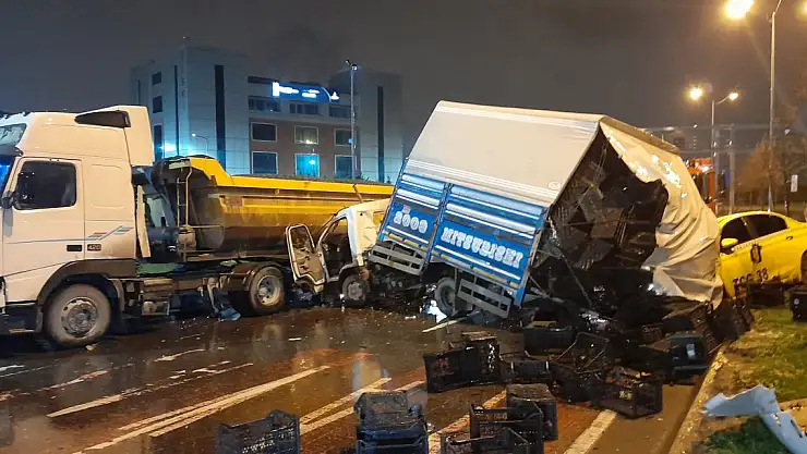 Hafriyat kamyonuna çarpan kamyonet, taksiyi altına aldı: 3 yaralı