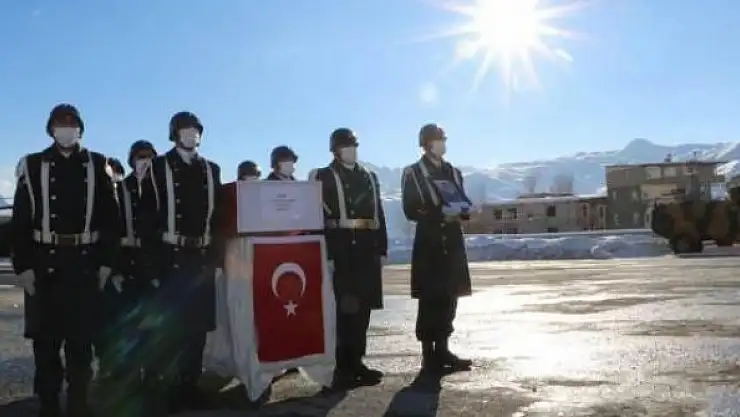 Hakkari'nin Yüksekova ilçesinde Fatih Kışlası'ndaki törende şehidin Türk bayrağına sarılı tabutu alana getirilerek saygı duruşunda bulunuldu.