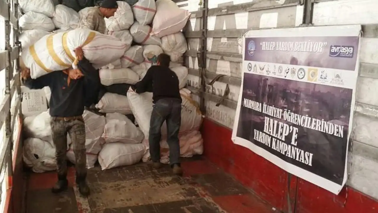 Marmara Üniversitesi (MÜ) İlahiyat Fakültesi öğrencilerinin başlattıkları "Halep Yardım Bekliyor" kampanya kapsamında temin edilen 250 bin kıyafet ve 125 gıda kolisi, Suriye'ye gönderildi.