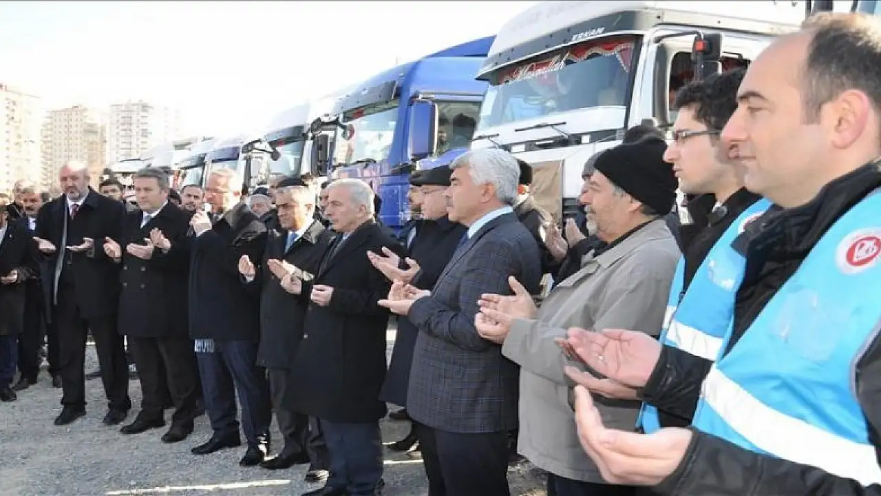 Konuşmaların ardından, dua edildi. 12 tır, yardım malzemelerini Halep'e ulaştırmak üzere Hatay'ın Reyhanlı ilçesine uğurlandı.
