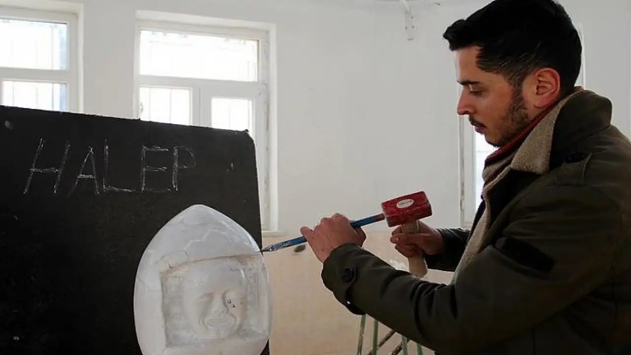 Sivas'ta bir üniversite öğrencisi, Halep'te yaşanan katliamlara dikkat çekmek için 'bombalar altında doğmak istemeyen bebekleri' mermere işledi.