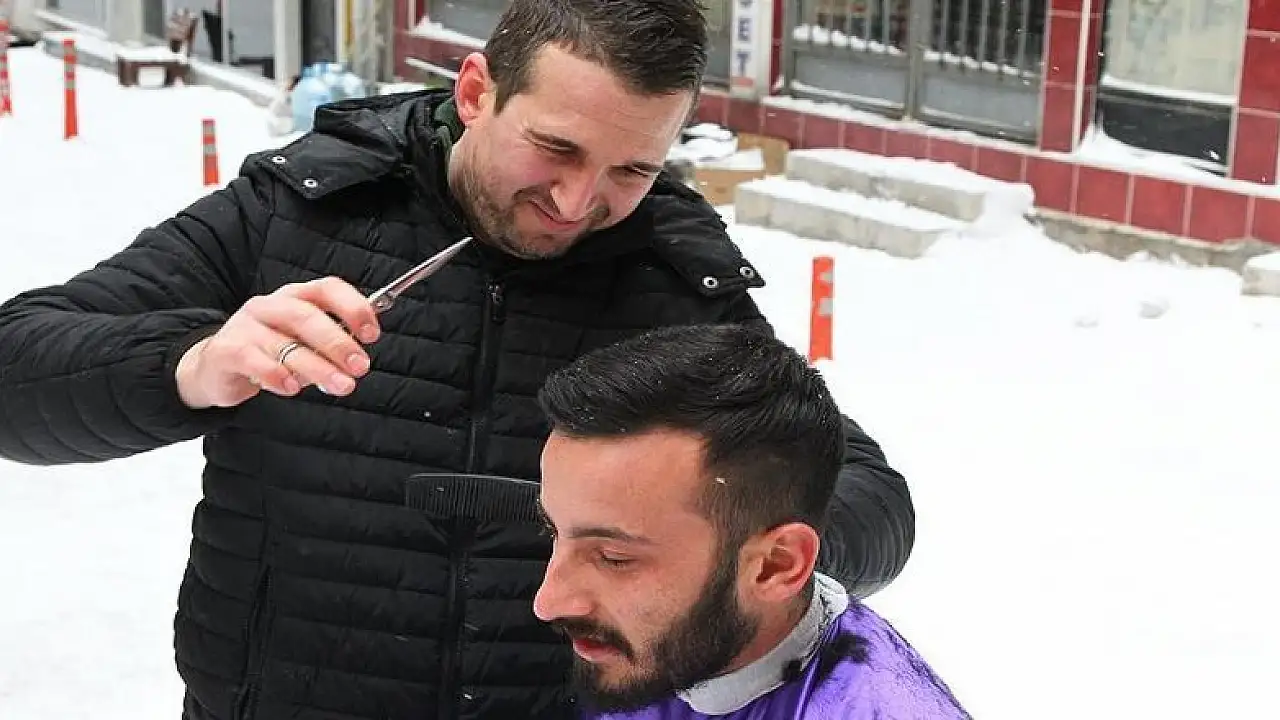 Kar yağışı altında tıraş yapmanın ayrı bir zevk olduğunu dile getiren Ellez, birçok müşterisinin de kar altında tıraş olmak istediğini aktardı.