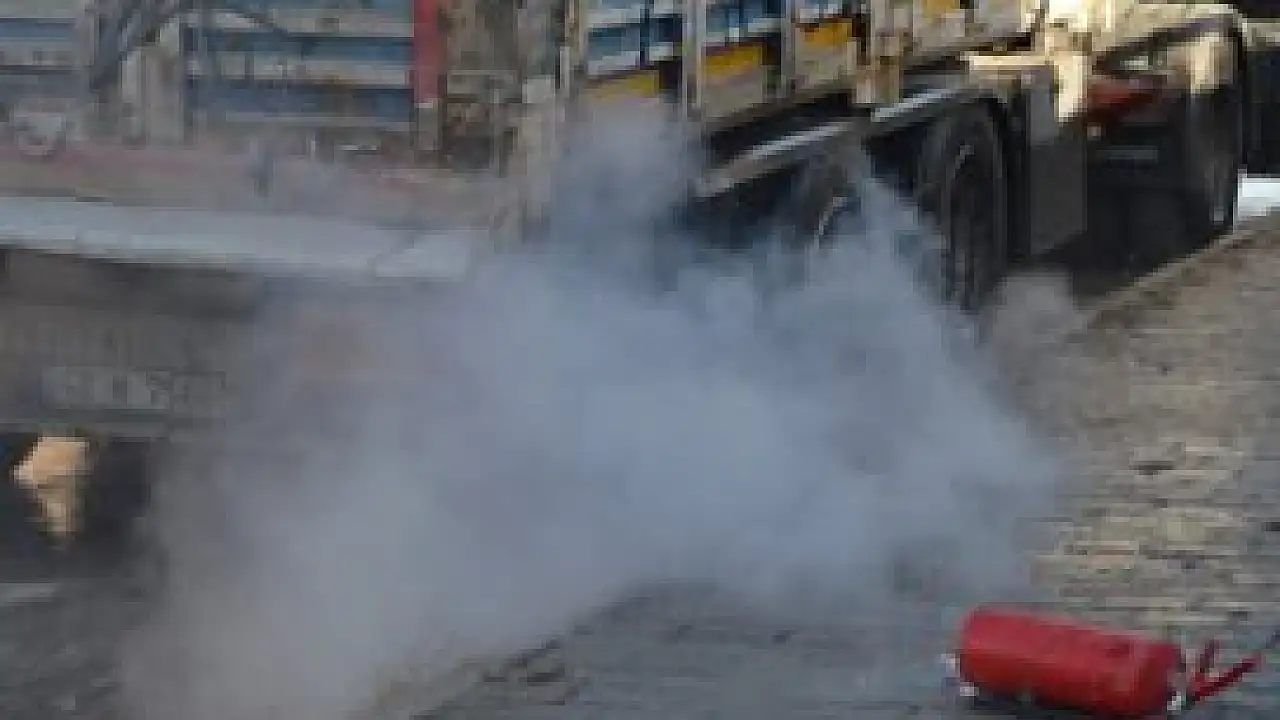 Konya'nın Kulu ilçesinde, hareket halindeki tırın dorse lastiklerinden biri yandı.