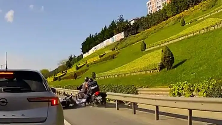 İstanbul Ümraniye'de emniyet şeridinde seyreden 2 motosikletli, hatalı sollama yaparak kontrolsüz bir şekilde emniyet şeridine geçiş yapan başka bir motosiklet sürücüsüne çarptı. Çarpışma sonrası yola savrulan 2 motosikletliden biri yaralandı. Kaza, başka bir aracın araç içi kamerasına saniye saniye yansıdı.