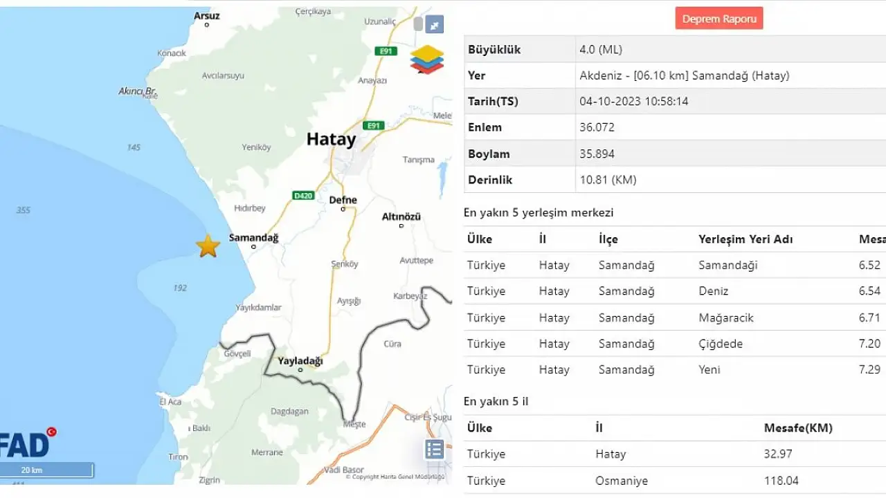 Afet ve Acil Durum Yönetimi Başkanlığı'nın (AFAD) verilerine göre, saat 10.58'de merkez üssü Hatay'ın Samandağ ilçesi olan 4.0 büyüklüğünde deprem meydana geldi. Yerin 10.81 kilometre derinliğinde kaydedilen deprem, kent merkezinde de hissedildi. Depremde, herhangi bir olumsuzluk yaşanmadığı kaydedildi.