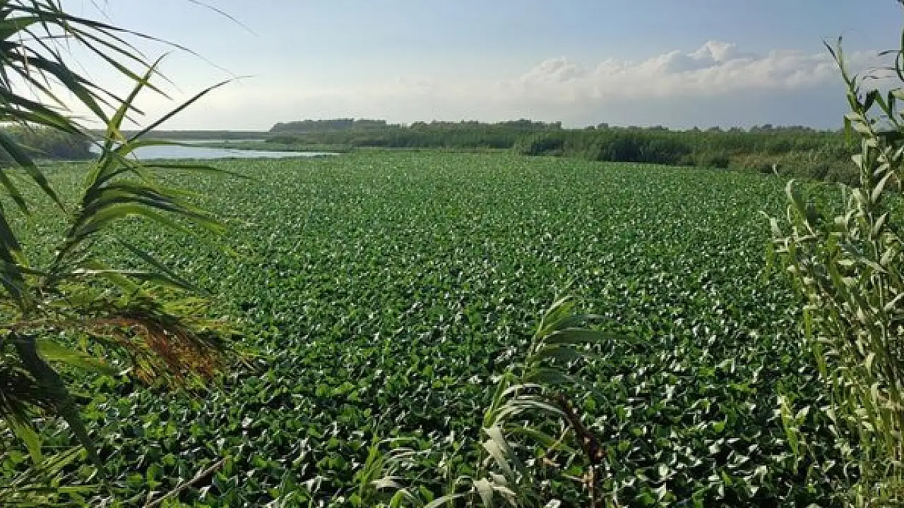 Su sümbüllerinin nehrin bazı bölgelerini kaplaması sonucu su yüzeyi yeşile büründü.