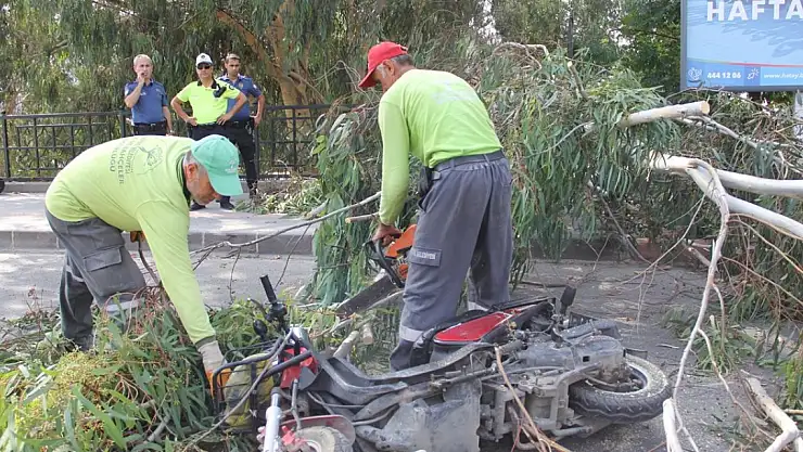 Turunçlu Mahallesi'nde bir ağaç, seyir halinde bulunan 31 MAR 26 plakalı motosikletin üzerine devrildi.