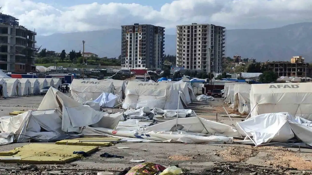 Kahramanmaraş merkezli depremlerin en büyük yıkımı yaptığı Hatay'da, dün geceden itibaren aralıklarla devam eden sağanak yağış ve şiddetli fırtına etkili oldu. Ekipler çadır kentlerin su altında kalmaması için büyük çaba sarf ederken, vatandaşlar da zor anlar yaşadı. Antakya ve Defne ilçelerindeki bazı çadır kentlerdeki çadırlara rüzgar zarar verdi. Birçok çadır tamamen yıkılırken, vatandaşlar güvenli noktaya taşındı. Çadırların etrafında kum, kum torbası ve iple alınan tedbirlere rağmen şiddetli rüzgarda onlarca çadır yıkılırken, Mehmetçik ve görevliler diğer çadırların yıkılmaması için önlemler aldı. Görevliler vatandaşların eşyalarının ıslanmaması için palet dağıtımı da gerçekleştirdi. Fırtınanın gece yarısı etkisini kaybetmesi bekleniyor.