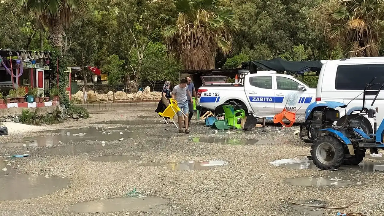 HATAY'ın Samandağ ilçesinde etkili olan yağışın ardından denizde oluşan hortum, sahil kenarındaki iş yerlerinde hasara neden oldu.
