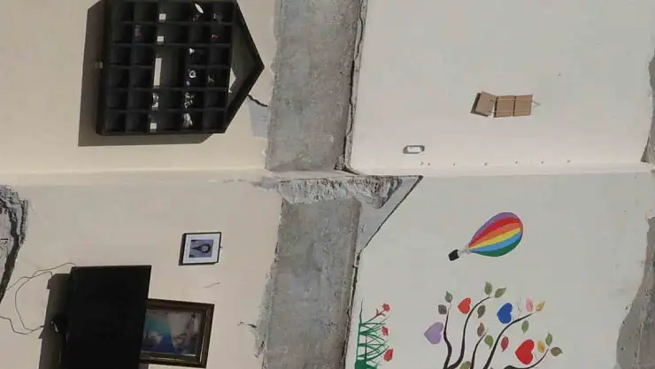 Kahramanmaraş depremi, Hatay'ın Antakya ilçesinde yıkılan binanın duvarının olmadığını ortaya çıkardı. Enkazın ardından, yan binanın duvarına asılı kalan televizyon, raf ve aile fotoğrafı kaldı.