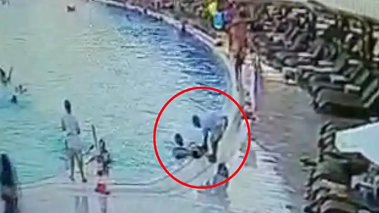 Antalya'nın Serik ilçesinde ailesiyle tatil yaptığı otelde havuza giren Ömer Asaf D. (7), boğulma tehlikesi geçirdi. Çevredeki bir kişi tarafından kurtarılan çocuk cankurtaranların ilk müdahalesinin ardından hastanede tedaviye alındı. Çocuğun kurtarılma anları güvenlik kamerasına yansıdı.