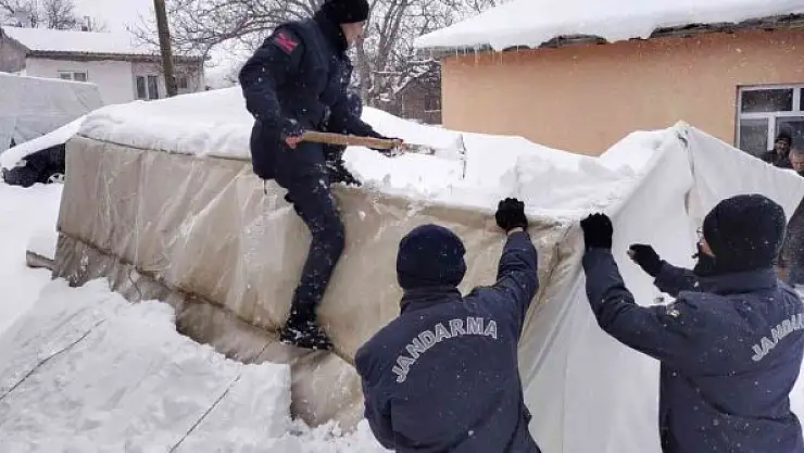 Elazığ'da yoğun kar yağışının ardından kent genelinde yol açma çalışmaları aralıksız devam ediyor. Ekipler ulaşıma kapanan köy yollarını açmak için yoğun mesai harcıyor. Baskil ilçesine bağlı Yalındamlar köyünde yaşayan Mehmet Hanifi Şahin de 112 Acil Çağrı Merkezi'ni arayarak, evinin önünde hayvanlarının yemini koyduğu çadırın kar nedeniyle çöktüğünü bildirdi. Engelli vatandaşın imdadına jandarma ekipleri koştu. İl Jandarma Komutanlığı ekipleri köye giderek ilk önce çadırı kaldırarak alan temizliği yaptı. Ekipler, daha sonra kar ve tipiden dolayı yıpranan çadırı onararak yeniden kurdu.