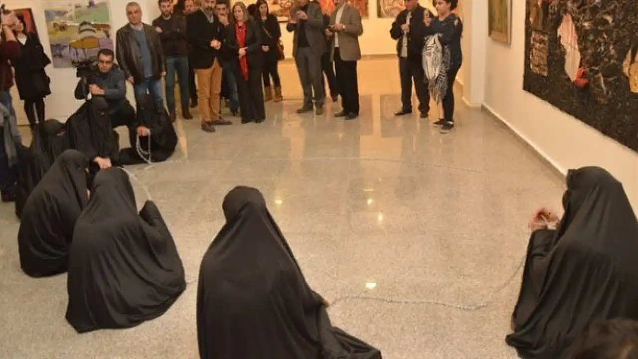 Kışanak'ın eserleri incelediği sırada çarşaf giydirilen veya çarşaflı olan altı kadının zincir vurularak galerinin ortasında "sanatseverlerin" beğenisine sunulduğu görüldü.