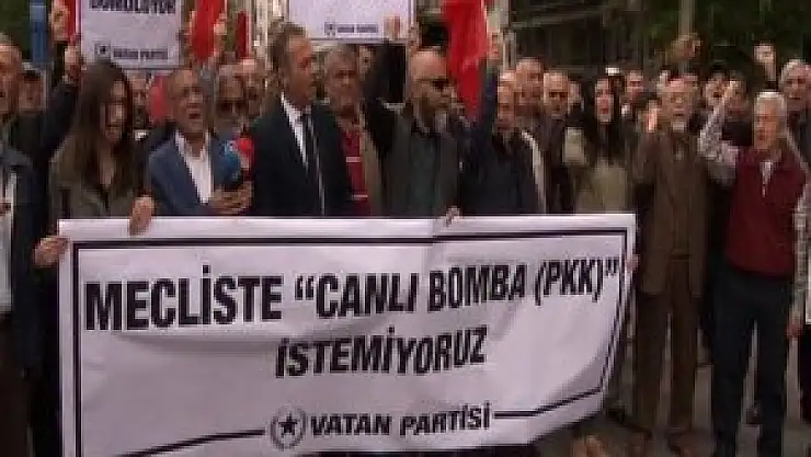 Güvenpark’ta toplanan grup adına bir konuşma yapan Vatan Partisi Ankara İl Başkanı Osman Yılmaz, “2 Mayıs Pazartesi günü TBMM’de bir canlı bomba saldırısı gerçekleşmiştir. Dokunulmazlıkların konuşulduğu komisyonda HDP’li sözde milletvekilleri PKK marşı söyleyerek, Öcalan lehine sloganlar atarak bölücü bir gösteri yapmışlardır. PKK, Sur’da, Cizre’de Nusaybin’de hendeklere gömülürken, Mecliste gösteri yapmaktadır. Milletimizin şehit cenazelerinde, ‘Mecliste PKK istemiyoruz’ sloganlarına karşı PKK Mecliste sloganla, marşla eylem yapmıştır” ifadelerini kullandı.
