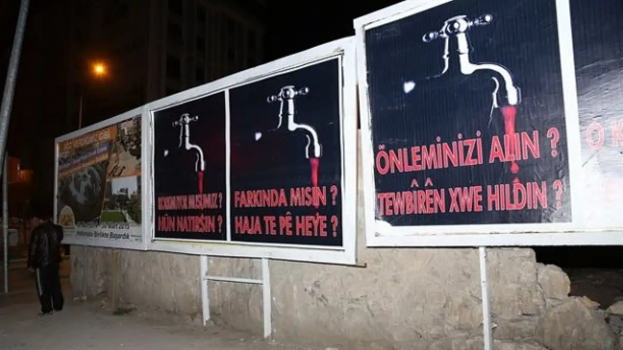 HDP'nin Van'da vatandaşları açıkça ölümle tehdit ettiği afişler kaldırıldı. HDP'li belediye musluktan kan akan ilanlar yerine bu kez su temalı ilanları astı. AK Parti İl Başkanı Zahir Soğanda, afişlerin mahkeme kararıyla kaldırıldığını söyledi. Afişlere t