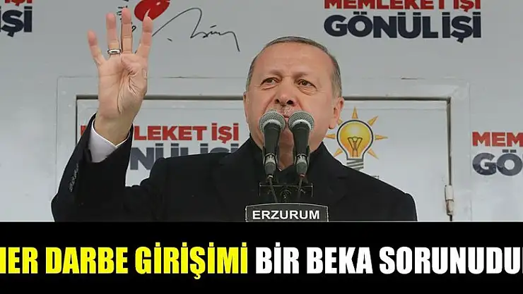 "Bu ülkenin tarihindeki her darbe, her cunta, her vesayet girişiminin bizatihi kendisi bir beka sorunudur." diyen Erdoğan, "Türkiye'nin darbeler, cuntalar, vesayetler defterinin bu karanlık sayfası bize, istiklal ve istikbalimize daha sıkı sarılmamız gerektiğini gösteriyor." ifadesini kullandı.