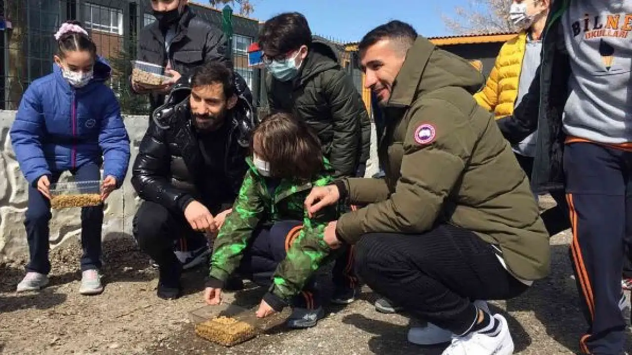 Ankara'da özel bir okulda öğrencilerle bir araya gelen futbolcular Mehmet Topal ve Şener Özbayraklı sokak hayvanları için mama topladı.