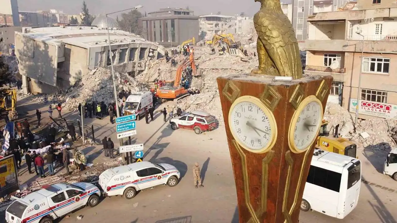 Depremin vurduğu Adıyaman'da, şehir merkezinde neredeyse tüm binalar yıkıldı ancak 40 yıllık saat kulesi enkazların arasında dimdik ayakta durdu. Kartal figürlü kulenin tarihi saati de depremin yaşandığı 04.17'yi göstermeyi sürdürüyor.