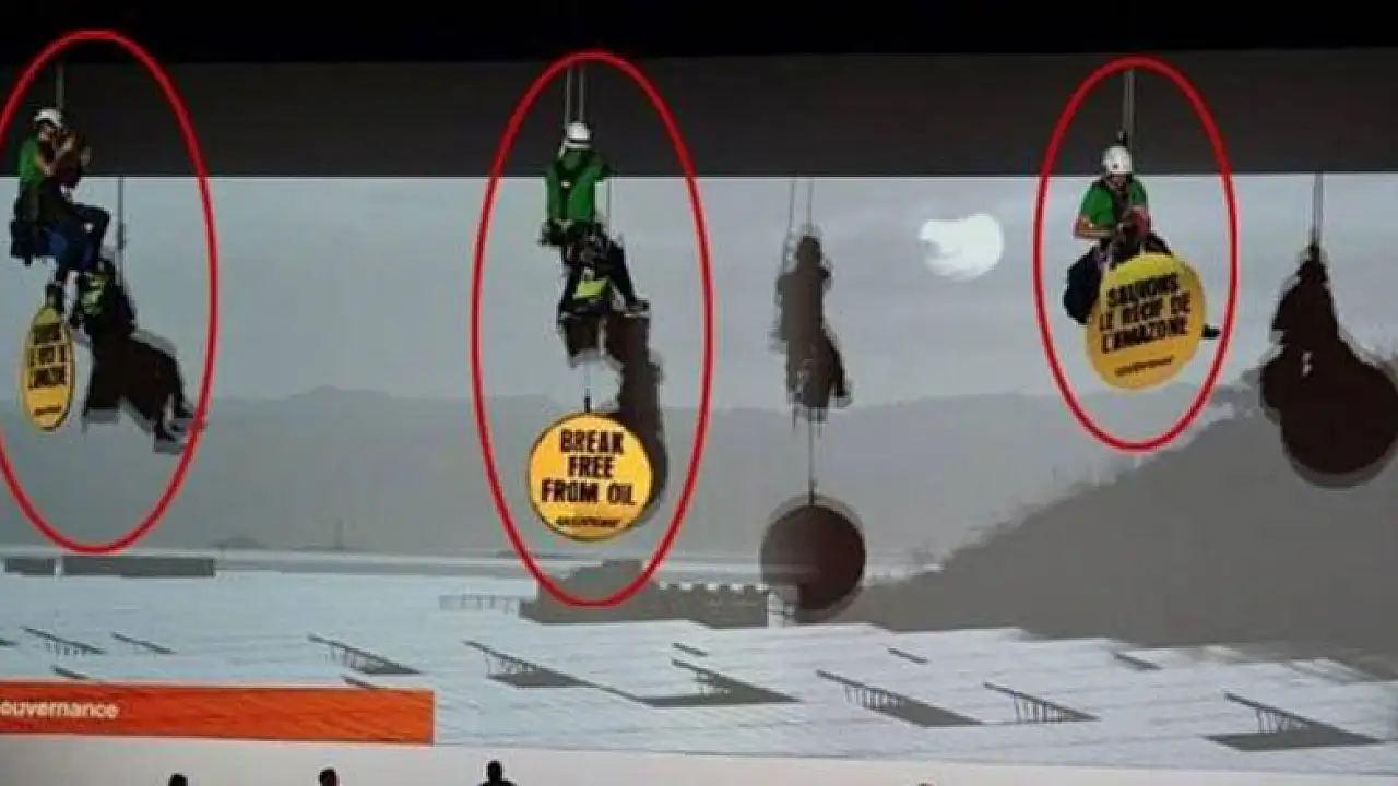 Fransa'nın başkenti Paris'te bir akaryakıt şirketinin yıllık toplantısını çevre aktivistleri bastı. Greenpeace üyeleri şirketin hissedarları için hazırladığı toplantıya bağlandıkları iple girdi ve her yere petrol döktü.