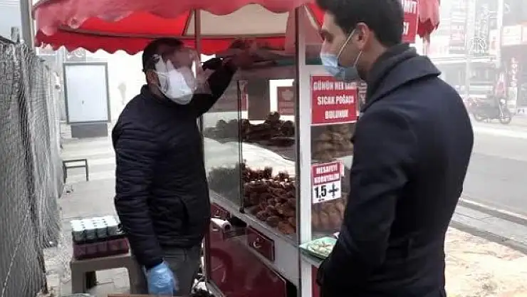 Simit tezgahının camına “Caddeye giriş ve çıkışlarda HES Kodu mecburiyeti getirilmiştir. Salgında mücadelede görevlilere yardımcı olmak için lütfen HES Kodunuzu alın" yazısı asan 20 senelik simitçi İsmail Yıltaş, siperlik, maske ve eldiven takarak müşterilerine hizmet veriyor. Müşterilerine de HES kodu olup olmadığını soruyor.