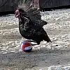 Balıkesir'in Ayvalık ilçesinde futbol tutkusu nedeniyle sahibinin 'Glu Glu Spor' adını verdiği 2 yaşındaki hindi, top sürüp şut çekiyor.