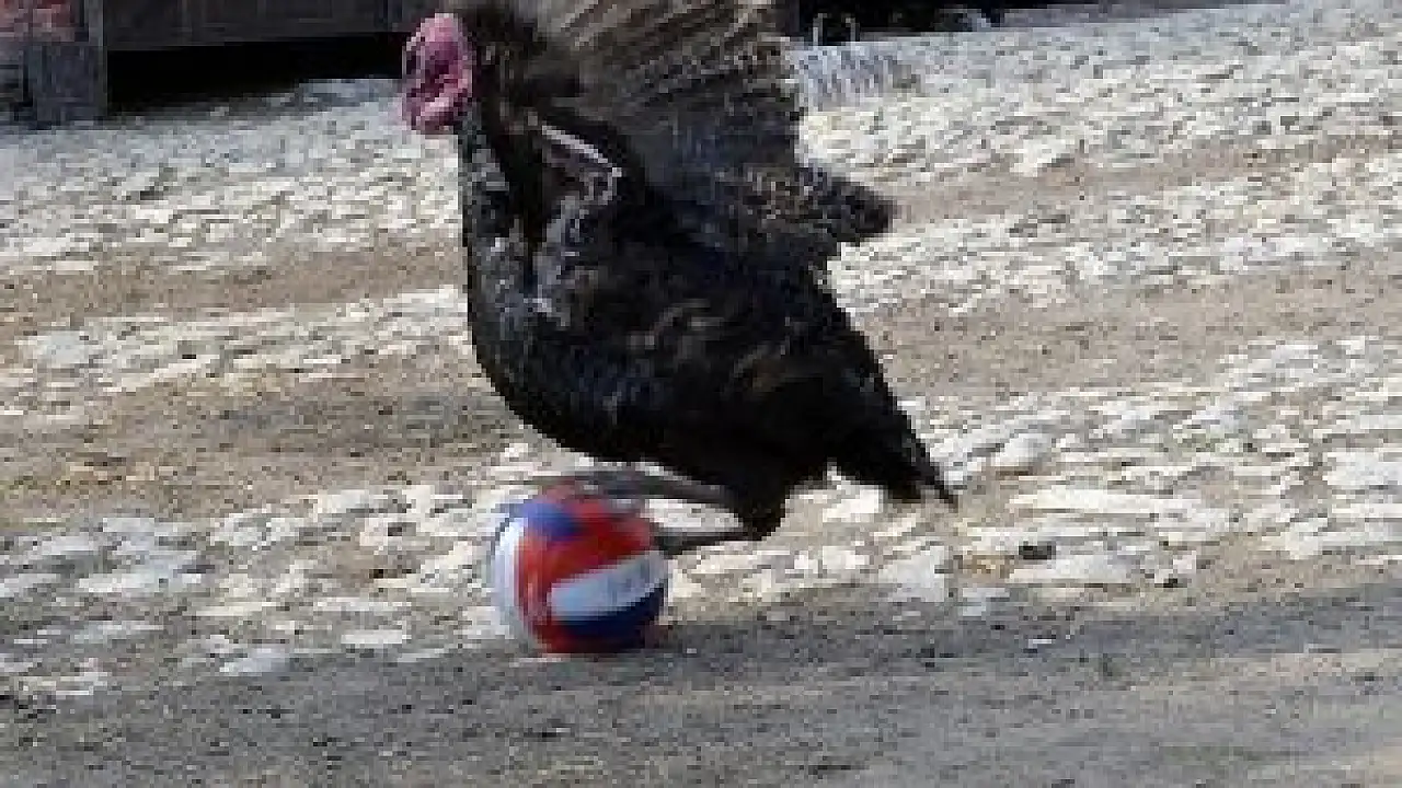 Topu gördüğü anda peşinden koşturan, adeta şut çeken ve top süren hindi, çiftlikte renkli görüntüler oluşturuyor.