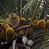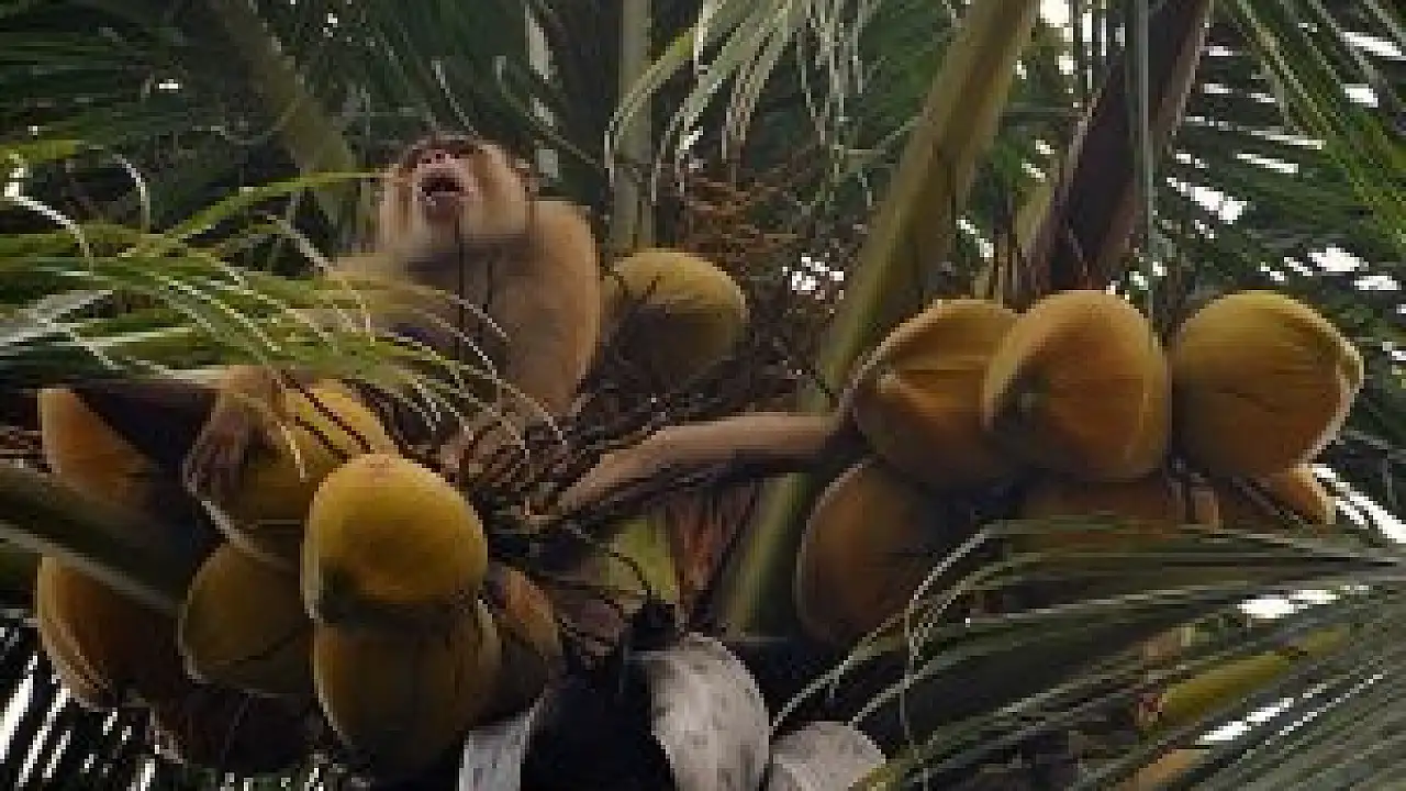Boyunlarına bağladıkları ip sayesinde kaçması önlenen maymun, kısa sürede tırmandığı ağaçtaki Hindistan cevizlerinin olgunlaşmış olanlarını diğerlerinden ayırt ederek koparıp aşağıya atıyor.