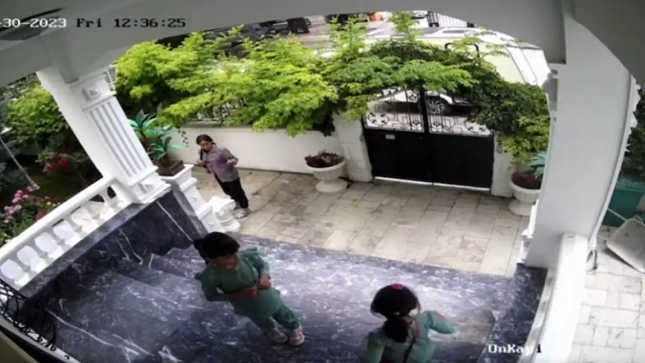 Evde kimsenin olmadığını fark eden kadın ve çocuklar bahçede bir süre gönüllerince eğlendi. Daha sonra hırsızlık için kadının eve gireceği anda alarm çaldı. Olayı fark edip güvenlik kamerasından yaşananları cep telefonundan izleyen ev sahibi kurdurduğu bağlantı sayesinde megafondan "polis geliyor" diye şeklinde ses gönderince paniğe kapılan kadın yanındaki çocukları alıp hızla kaçtı. Yaşananlar evin güvenlik kamerasına an be an yansıdı.