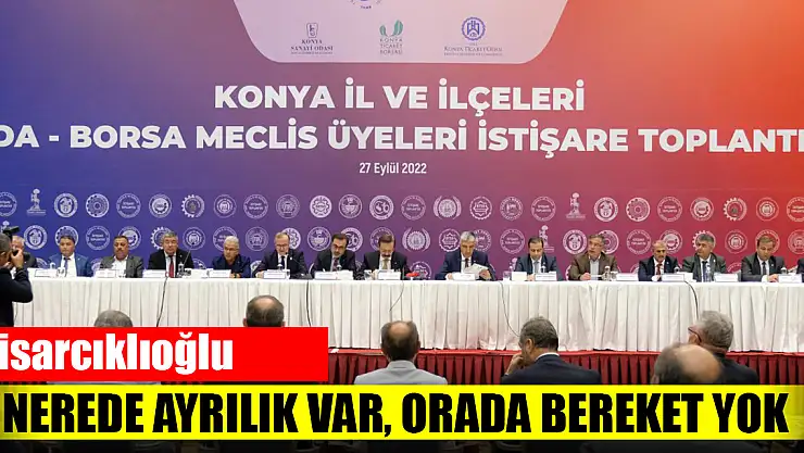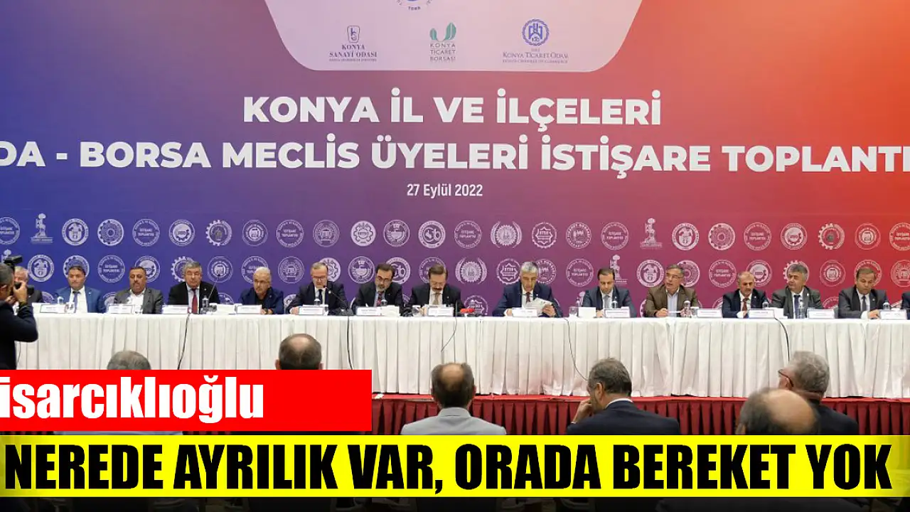 Türkiye Odalar ve Borsalar Birliği (TOBB) tarafından bir otelde düzenlenen Konya İl ve ilçeleri Oda-Borsa Meclis Üyeleri İstişare Toplantısı, TOBB Başkanı Rifat Hisarcıklıoğlu'nun başkanlığında düzenlendi. Hisarcıklıoğlu, "Türkiye'de marka olmuş şehirlerin arkasında niye bunlar marka oldu diye bakın, birlik ve beraberlik var. Nerede ayrılık var, orada bereket yok haberiniz olsun. Bu işinizde de böyle. Ortağınıza dikkat edeceksiniz kardeşim. Bir ve beraber, Allah rahmeti, bereketi öyle veriyor. İki kişi iyi ortaksa diyor üçüncü ortak benim diyor. Üçüncü ortağı alırsanız bileğinizi kimse bükemez. Bükülen bilek de varsa gelsin zararını benden alsın. Bileğinizi kimse bükemez. Onun için ne olur birbirinizi sevin. Birbirinizi ötekileştirmeyin; inancından, fikrinden, etnik kökeninden, mezhebinden, dininden farklı fikrinden dolayı ötekileştirmeyin birbirimizi sevelim başka kimsemiz yok. Farklı düşüncelerimizi koyacağız, tartışacağız değerli kardeşim. Tartışacağız, kendi içimizde kavga etmeye de gerek yok. Kim kimi ikna ederse, çoğunluk ne diyorsa ortak akıl o, istişarenin sonucu bu, hepimizin yolu bu. O yolda devam edeceğiz. Bunu yapan toplumlar kazanıyor, yapamayanlar kaybediyor." dedi.