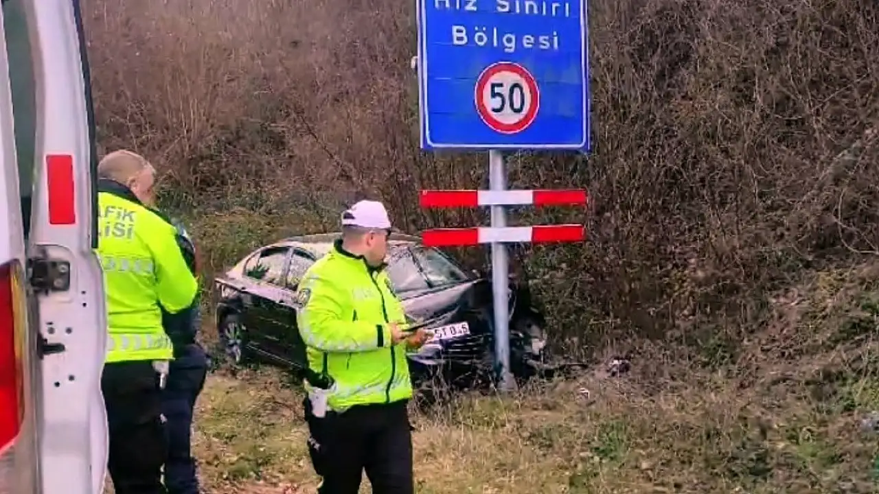 Bartın'da virajı alamayan otomobil önce bariyerlere, ardından ise hız uyarı tabelasına çarparak durabildi.