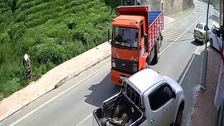 Olay, Rize'nin Çayeli ilçesi Büyükköy Beldesi'ne bağlı Merkez Mahallesi'nde meydana geldi. Edinilen bilgiye göre, yokuş aşağı seyir halinde olan kamyon, hızla viraja girdi. O esnada karşısından gelen bir araca çarpmak üzereyken yaptığı manevra ile kurtulurken arkadan gelen diğer bir çift kabin araçtan da son anda kurtuldu. Meydana gelen olay çevrede bulunan güvenlik kamerasına anbean yansıdı.