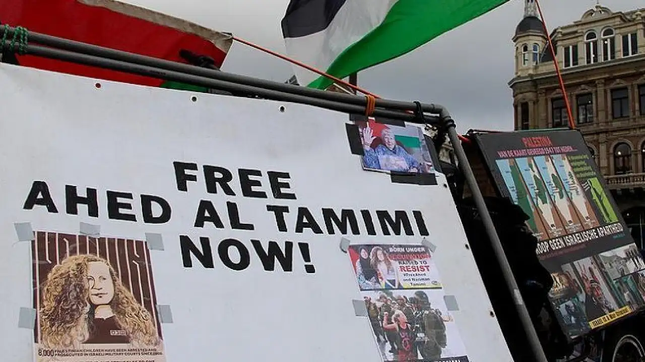 Hollanda'nın başkenti Amsterdam'da İsrail'in tutuklu yargıladığı "Hanzala Cesaret Ödülü" sahibi Filistinli Ahed et-Temimi'ye destek gösterisi düzenlendi.