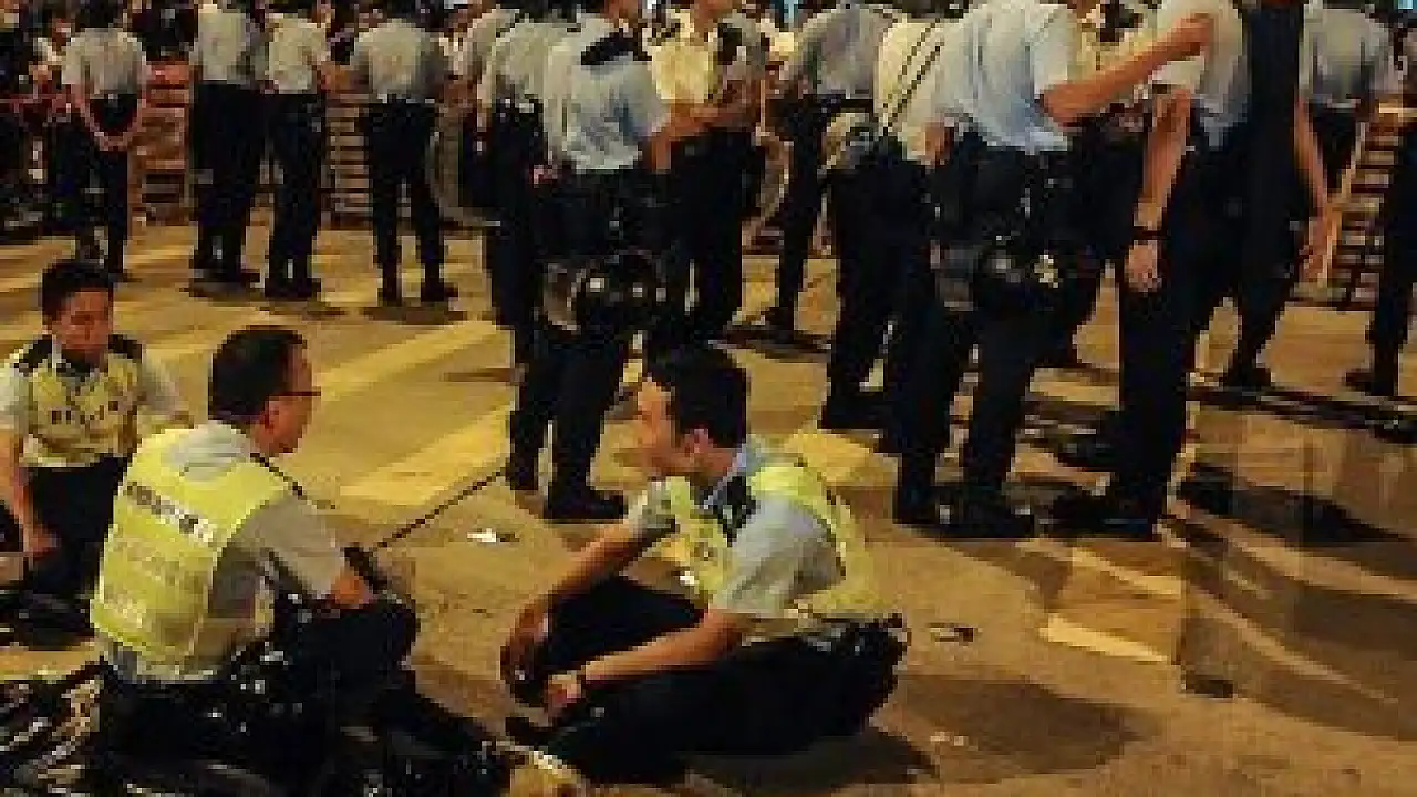 Hong Kok'un işlek ticaret bölgesi olan Mong Kok'ta yaklaşık 300 kişi ile polis arasında çıkan çatışmada güvenlik güçlerinin uyarı ateşi açtığı da ifade edilirken, tezgahlarını dağıtmak isteyen polise seyyar satıcıların taş ve sopalarla karşılık verdiği kaydedildi.