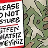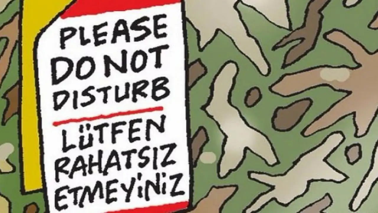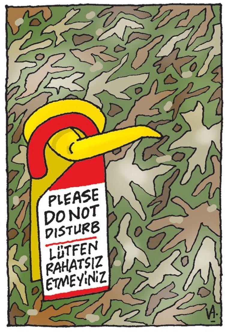 Latif Demirci'nin çizdiği karikatürde askeri kamuflaj desenli bir kapının tokmağına "Please do not disturb / Lütfen rahatsız etmeyiniz" yazılı uyarı levhasının asılı olduğu görülüyor.