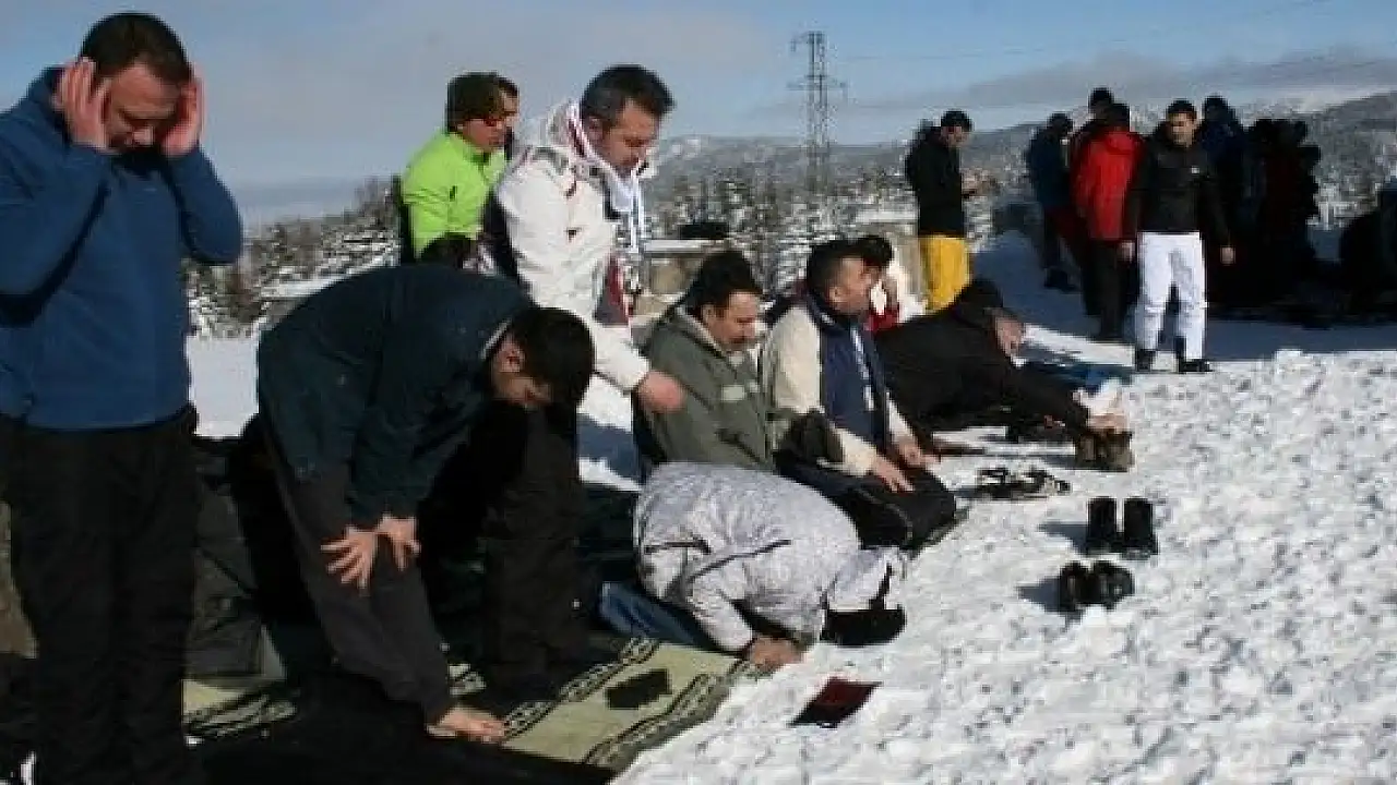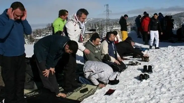 Uludağ'da yaşanan yoğunluktan dolayı cami yetersiz kalınca tatilciler kar üstünde cuma namazı kılmak zorunda kaldı.