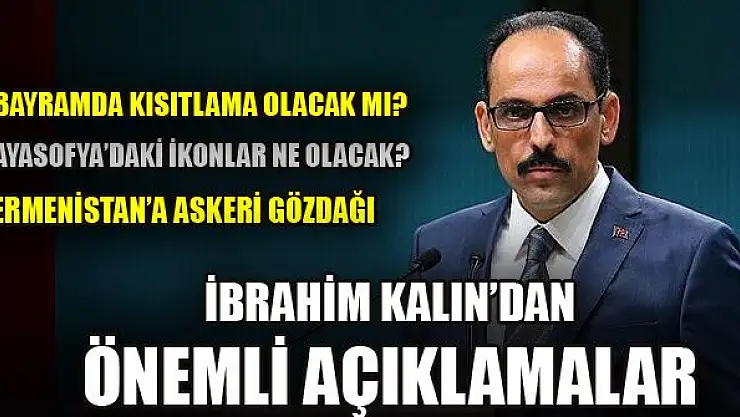 Cumnhurbaşkanlığı Sözcüsü İbrahim Kalın, katıldığı canlı yayın programında, Ayasofya ilgili son hazırlıklar ve bayramda kısıtlama olup olmayacağına dair önemli bilgiler paylaştı. Kalın'ın Azerbaycan-Ermenistan gerilimi ve Yunanistan ile Berlin'de yapılan görüşmeye ilişkin değerlendirmeleri de oldu.