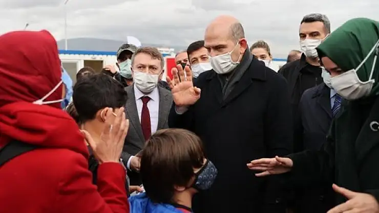 Bölgedeki çocuklarla da sohbet eden Bakan Soylu, depremzedelerle fotoğraf çektirdi.