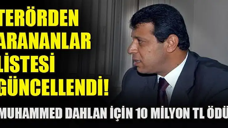 İçişleri Bakanlığının terörden arananlar listesi güncellendi. Muhammed Dahlan da listede 10 milyon TL ödüllü "kırmızı liste"ye girdi.