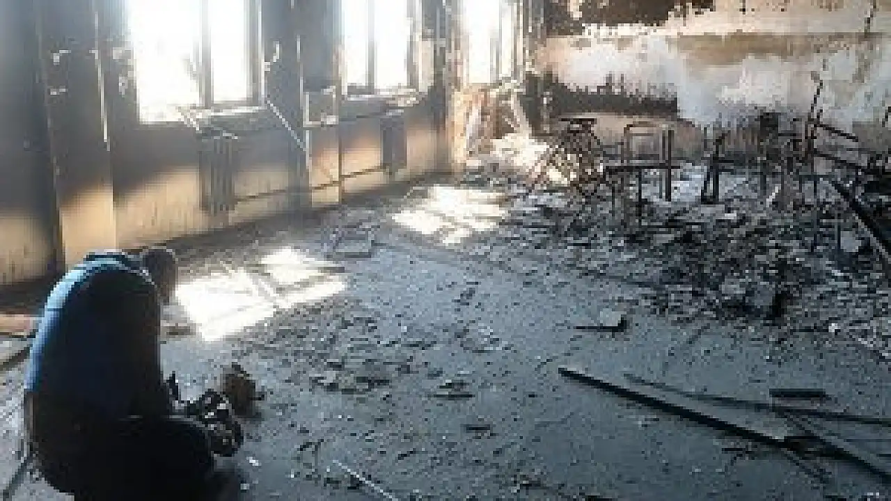 Geniş güvenlik önlemleri altında girilen bölgede teröristlerce patlayıcı yapımında kullanıldıktan sonra ateşe verilen İdil Anadolu Lisesinin büyük oranda tahrip olduğu görüldü.