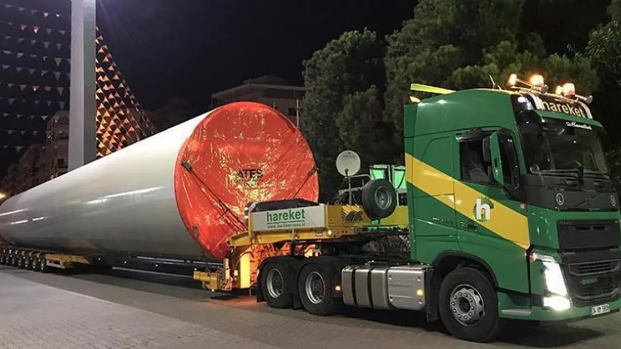 Nakliye firmasının İzmir Bölge Müdürü Levent Çağkan Özkan, gazetecilere yaptığı açıklamada, boyu 96 metre, ağırlığı ise 65 ton olan türbini gerekli izinleri alarak özellikle trafiğin yoğun olmadığı gece saatlerinde taşıdıklarını bildirdi.